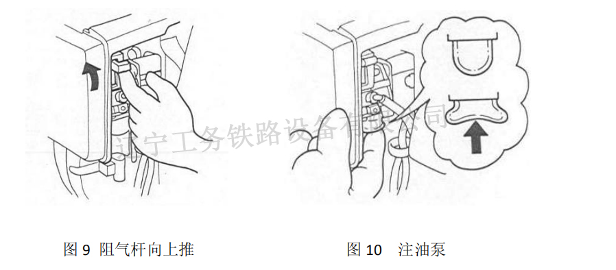 首先將汽油機的啟動開關撥至“ON”位置(處于汽油機右側(cè));然后把阻氣桿移至關閉位置(見圖 9),氣門處于關閉位置,按注油泵數(shù)次直到汽油回管中可以明顯地看到油流時為止(見圖 10)